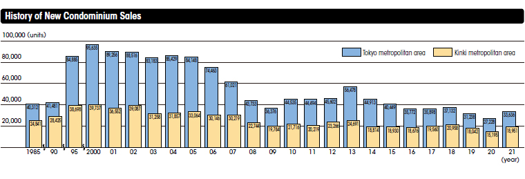 History of Floor Space per Unit for New Housing Starts (Tokyo Area: by Overall Average and Use)